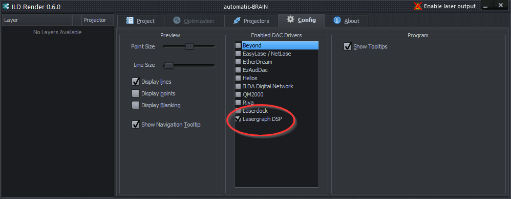 - To enable output to the Lasergraph DSP first enable the Lasergraph DSP driver in ILD Render and restart ILD render: